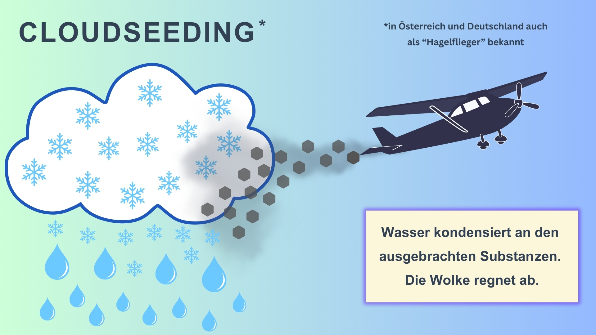 Unter Cloudseeding versteht man Verfahren, bei denen gezielt Substanzen wie Silberiodid, Kaliumiodid, Trockeneis oder auch Salz in Wolken eingebracht werden. Ziel ist es, die Niederschlagsmenge (Regen oder Schnee) zu erhöhen, Hagel zu verhindern oder Nebel aufzulösen. 5 Das Prinzip dahinter ist vergleichsweise einfach: Die ausgebrachten Substanzen wirken als Kondensationskeime für die vielen winzigen Wassertröpfchen oder Eiskristalle in der Wolke. Diese lagern sich an die Partikel an, wachsen und fallen schließlich als Niederschlag. Bei der Hagelabwehr sorgt das Verfahren dafür, dass sich viele kleine Hagelkörner bilden, bevor größere entstehen können.