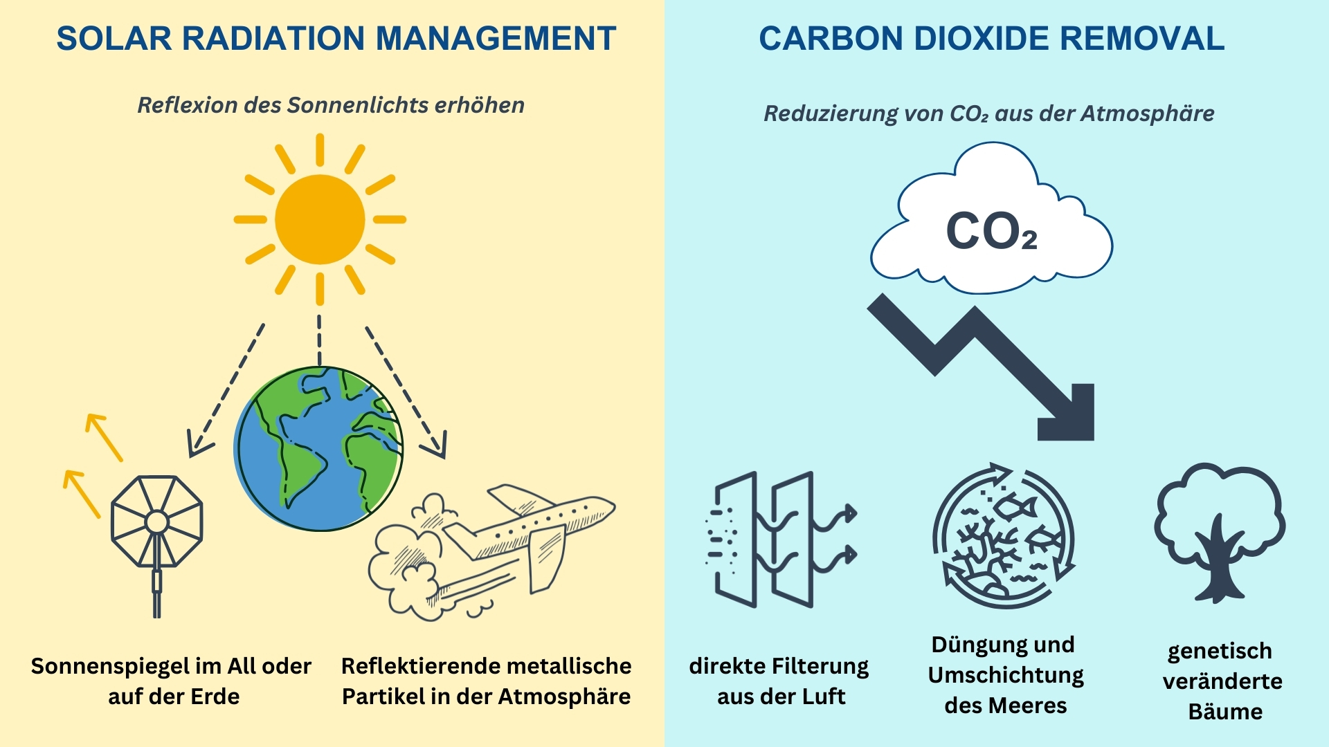 „Carbon Dioxide Removal“ beschreibt hingegen Maßnahmen, welche die Konzentration von CO₂ in der Atmosphäre verringern. Dies soll erreicht werden, indem man CO₂ direkt aus der Luft filtert oder die Ozeane großflächig mit Phosphor, Stickstoff, Eisen oder anderen Elementen „düngt“. Der Größenwahn mancher Wissenschaftler zeigt sich auch darin, dass ernsthaft darüber nachgedacht wird, das Meerwasser künstlich umzuschichten. Warmes Oberflächenwasser soll mittels Pumpen durch kaltes Tiefenwasser ersetzt werden. Ein Eingriff, der das hochkomplexe Ökosystem Meer in seinen Grundlagen bedrohen würde. Die natürlichen marinen Schichtungen sind entscheidend für das Leben im Ozean – ihre Zerstörung hätte unabsehbare Folgen. Weiters zieht man in Betracht, Biomasse und Ernteabfälle luftdicht im Boden oder im Meer zu versenken. Damit soll verhindert werden, dass bei den natürlichen Zersetzungsprozessen abgestorbener Pflanzen CO₂ wieder in die Atmosphäre gelangt. Man erwägt auch geklonte oder genetisch veränderte Bäume zu pflanzen, die mehr CO₂ aus der Luft binden – Plantagenwälder, losgelöst von den natürlichen Gegebenheiten des Standorts. 3