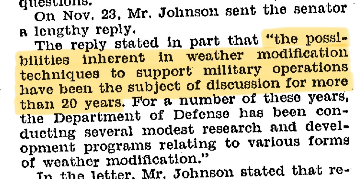 "Die Möglichkeiten, die in Wettermodifikationstechniken zur Unterstützung militärischer Operationen liegen, sind seit mehr als 20 Jahren Gegenstand von Diskussionen. Während dieser Jahre hat das Verteidigungsministerium mehrere kleinere Forschungs- und Entwicklungsprogramme zu verschiedenen Formen der Wettermodifikation durchgeführt.“