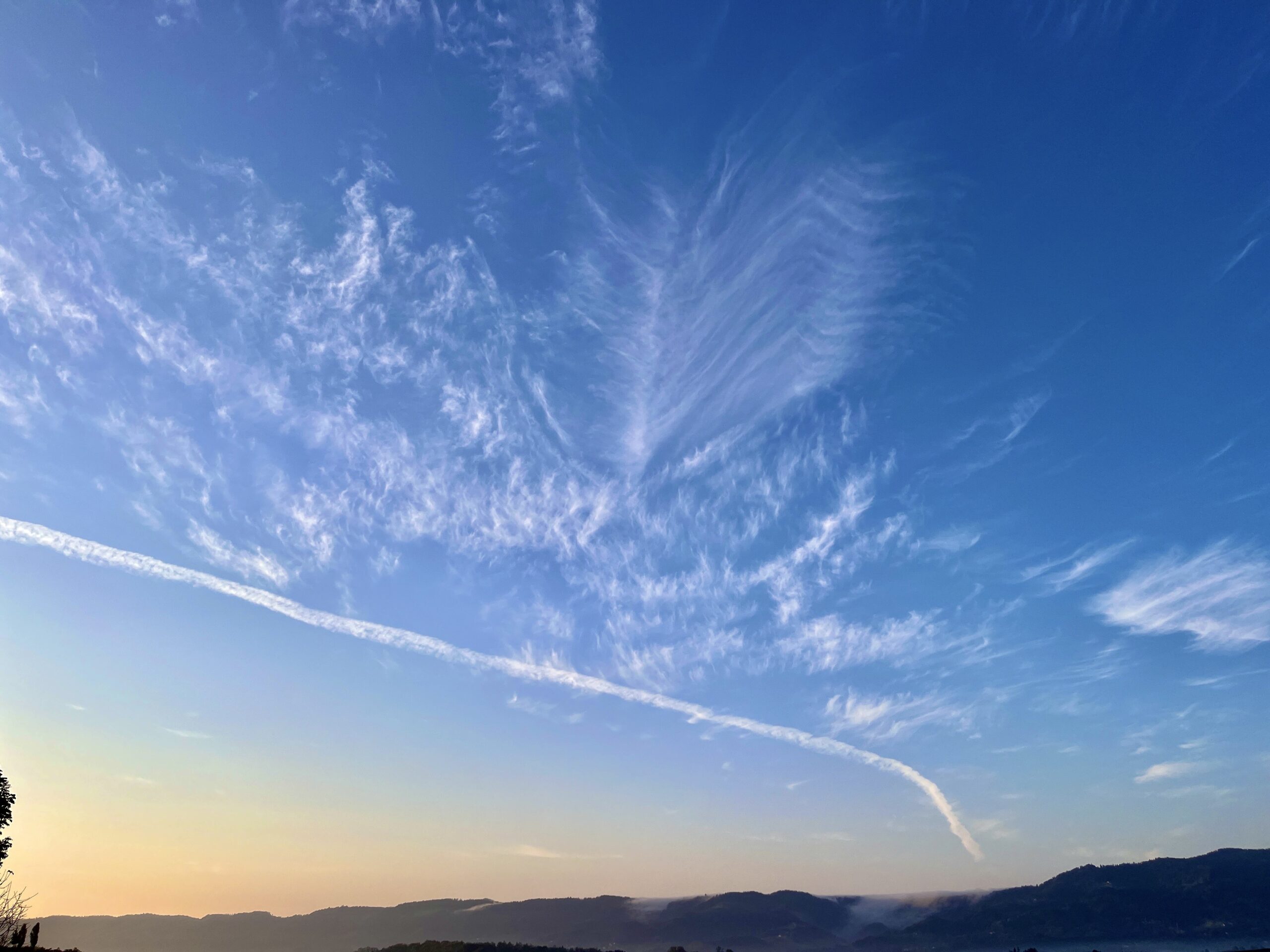 Die faserartigen Strukturen stehen dabei für den natürlichen, lebendigen Prozess, während der Kondensstreifen darunter die technische Beeinflussung der Atmosphäre sichtbar macht.